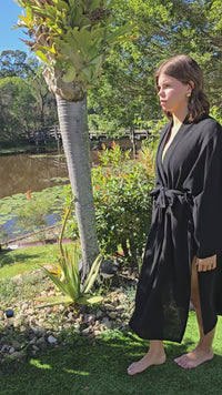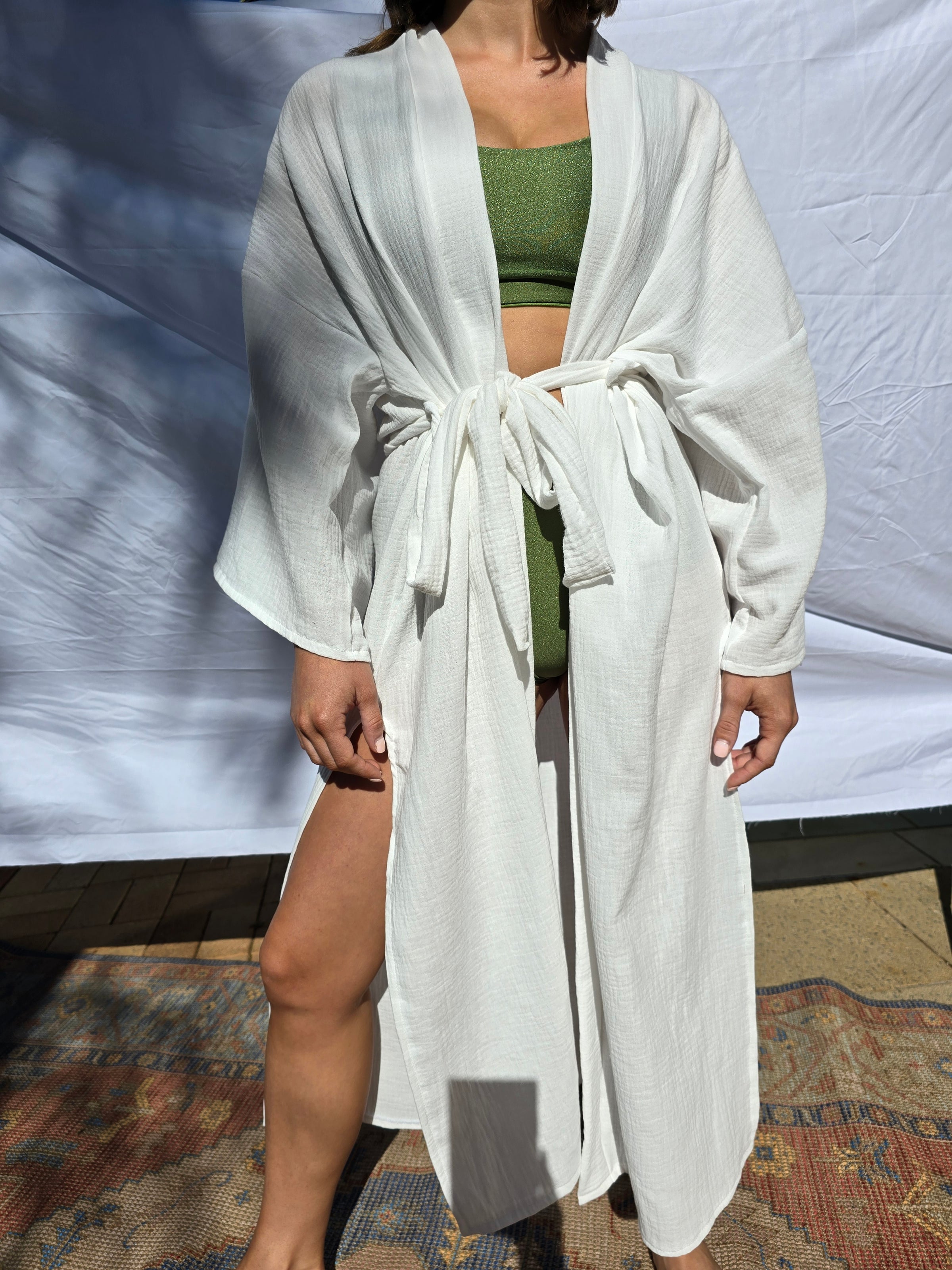 Castaways Kimono is your quick way to slide into holiday mode. Soft flowing breathable cotton wide sleaves and drawstring closure.