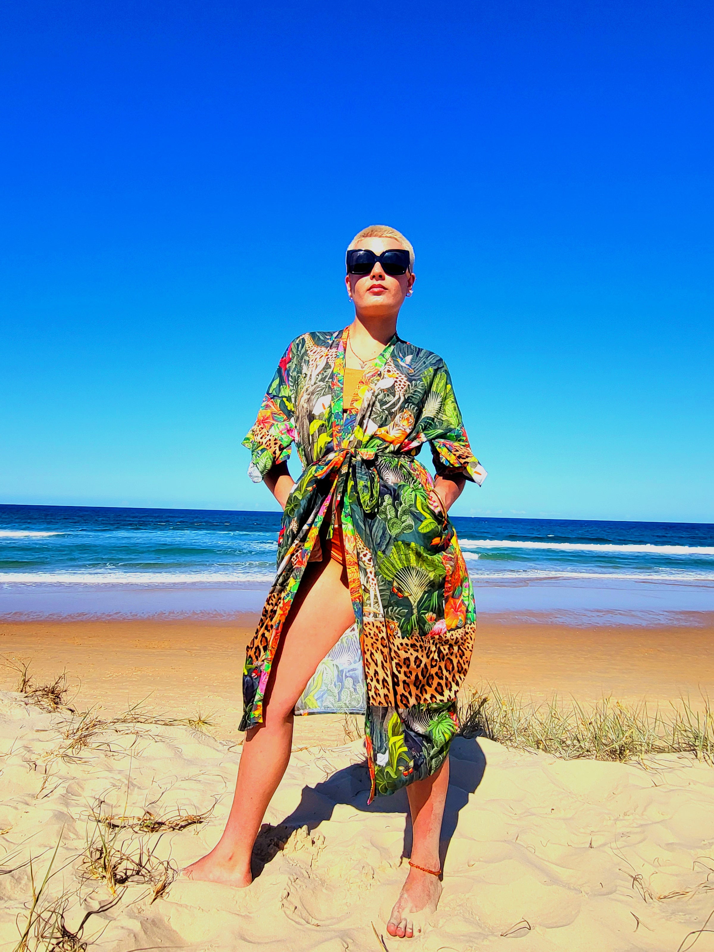 Madagascar Kimono beautiful jungle print and bright floral layered with leopard gives crazy jungle vibes.